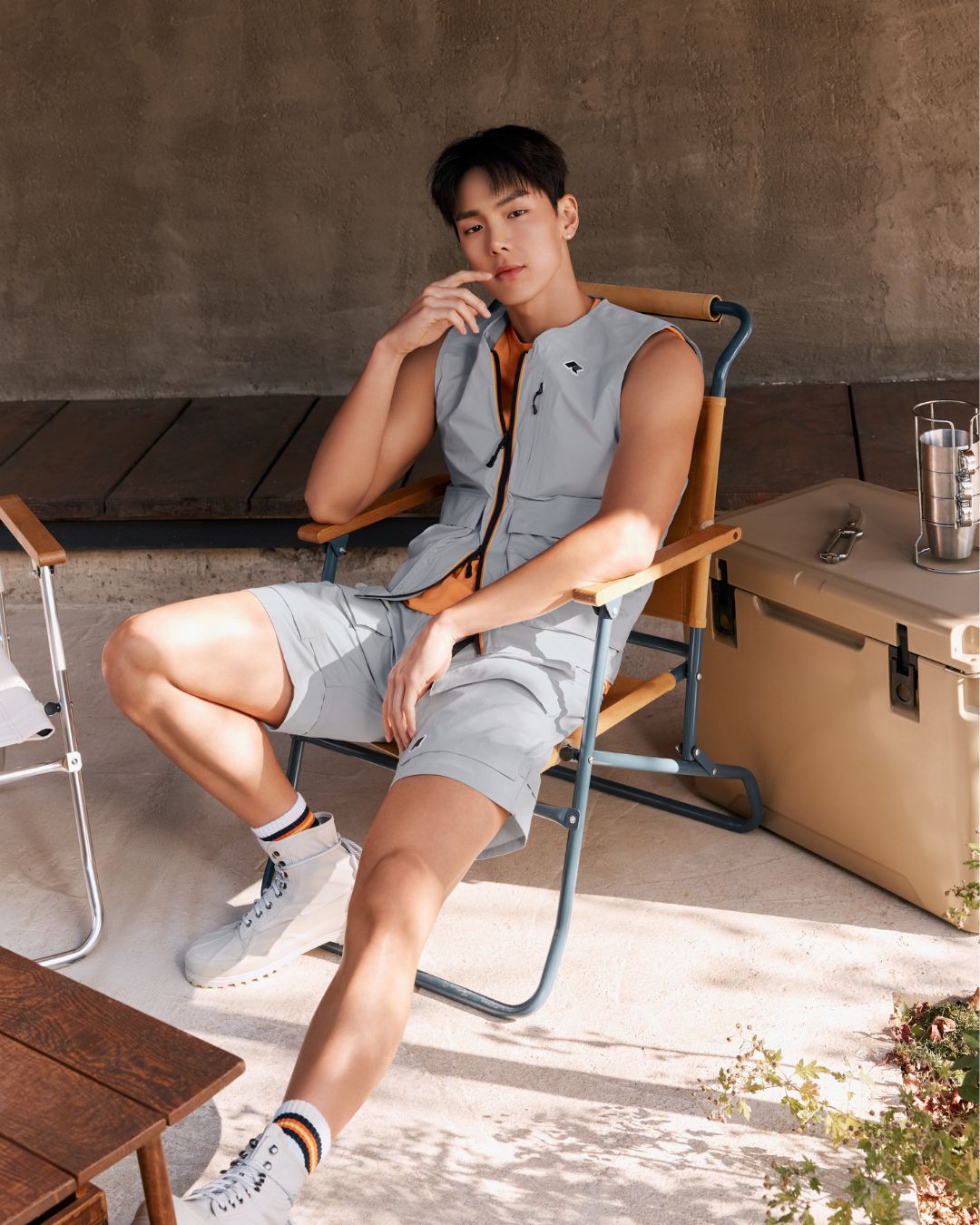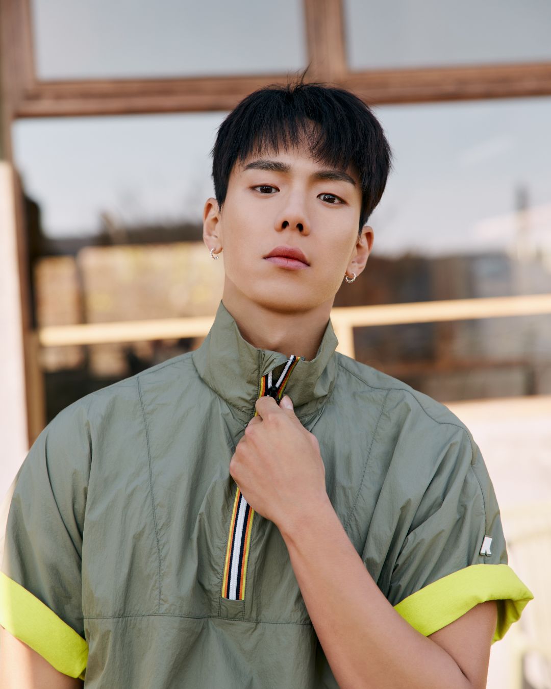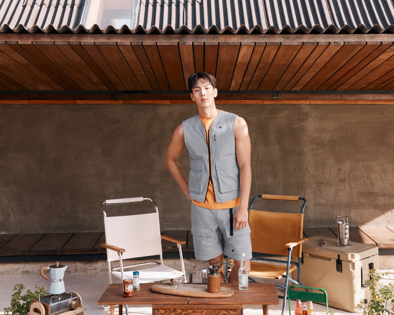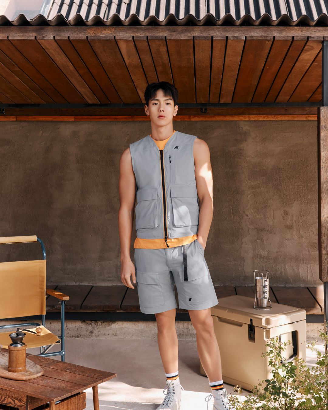 Inspired by outdoor life, the collection channels the raw energy of nature trips and busy travel itineraries through smart design: wrinkle-free fabrics, packable silhouettes, and utility details ready for any terrain. Shownu wears these pieces with ease,bringing a fresh, urban attitude to mountain-ready apparel.