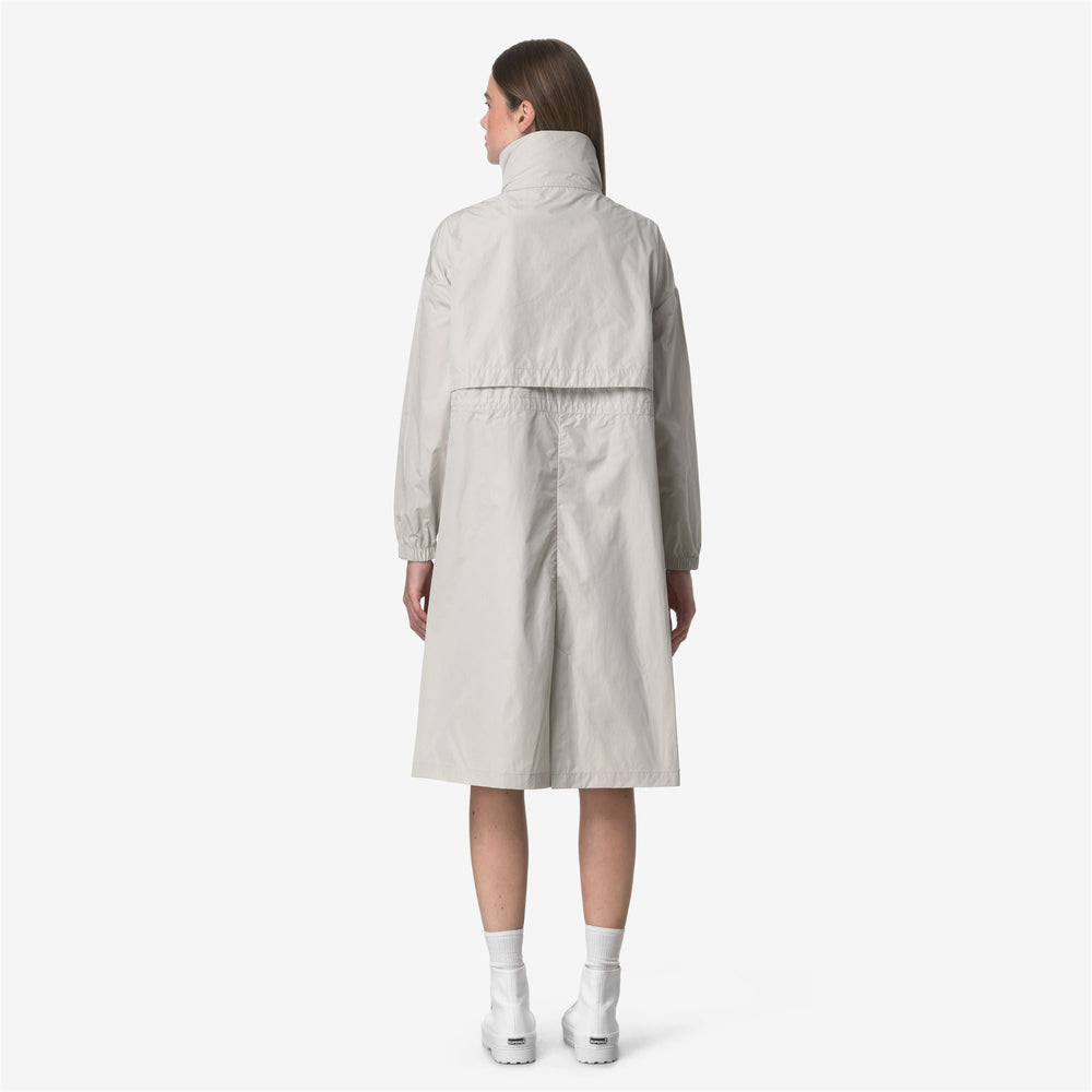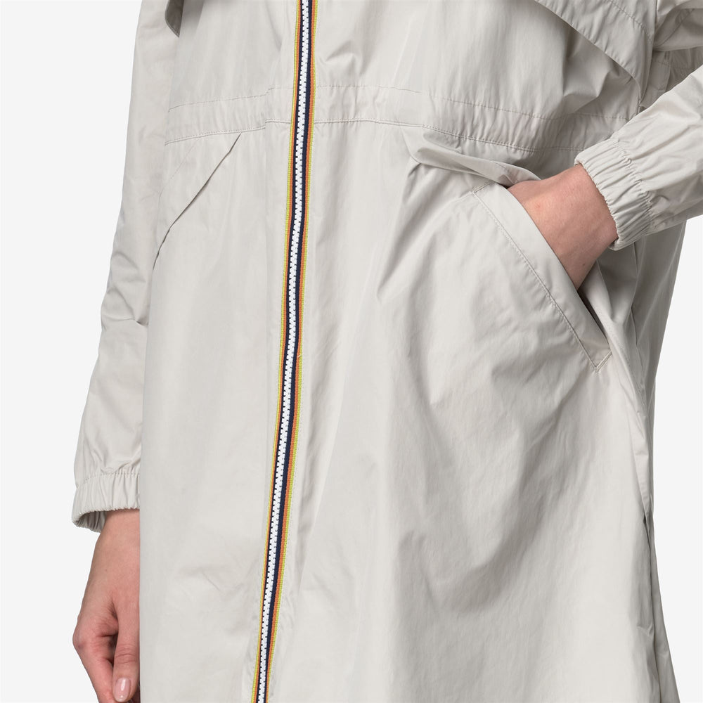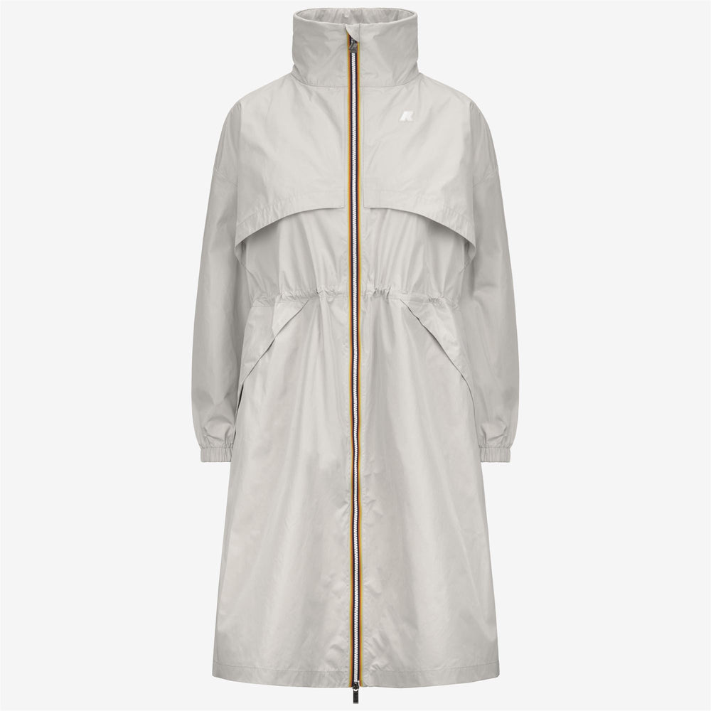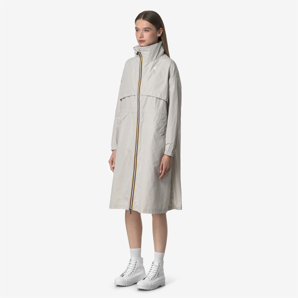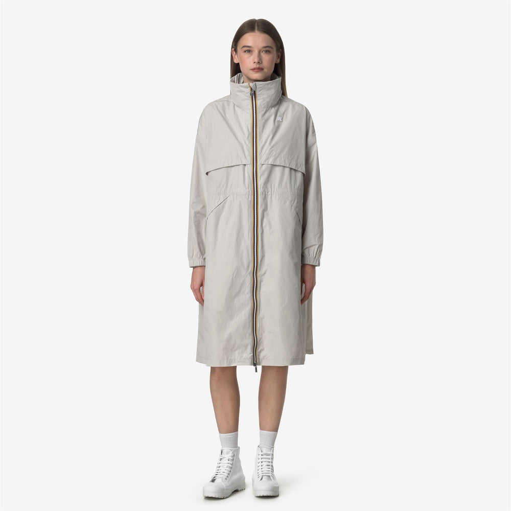 Aube is a women's long jacket designed to celebrate the brand's sporty spirit thanks to the smooth, rubberized fabric and full-length style with oversized details such as maxi pockets and maxi front flaps. The jacket features a zip closure in K-Way signature colours, a high collar, elasticated cuffs and an adjustable drawstring at the waist.