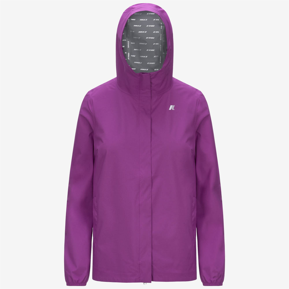Marguerite is a women's medium-length jacket, perfect for transitional seasons. It's crafted from stretch technical fabric that allows for unrestricted movement while providing rain and wind protection, with water resistance up to 10000 mm. The interior is lined with an insulating membrane with all-over silver-tone K-Way lettering print. Functional details, such as zipped pockets, a wrap-around adjustable hood, and elasticated cuffs and hem ensure an easy, comfortable fit.