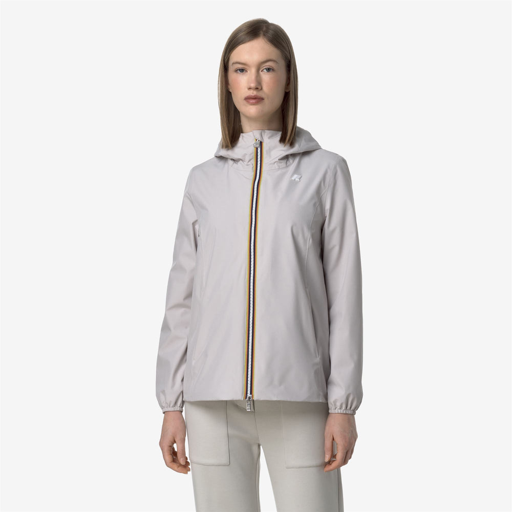 Marguerite is a women's short jacket offering a mid-season warmth grade. It boasts a casual, modern look, and is made from stretch polyester with a waterproof and windproof coating plus a soft grey melange cotton jersey lining. The inner heat-taped seams and the waistband decorated with the iconic multicoloured K-Way tape provide a distinctive signature touch.