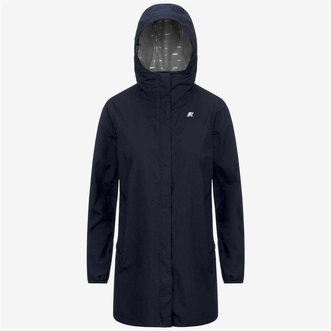 Sophie is a women's three quarter-length slim fit jacket, perfect for transitional seasons. It's crafted from stretch technical fabric that allows for unrestricted movement while providing rain and wind protection, with water resistance up to 10000 mm. The interior is lined with an insulating membrane with all-over silver-tone K-Way lettering print. Functional details, such as zipped pockets, a wrap-around adjustable hood, and elasticated cuffs ensure an easy, comfortable fit.