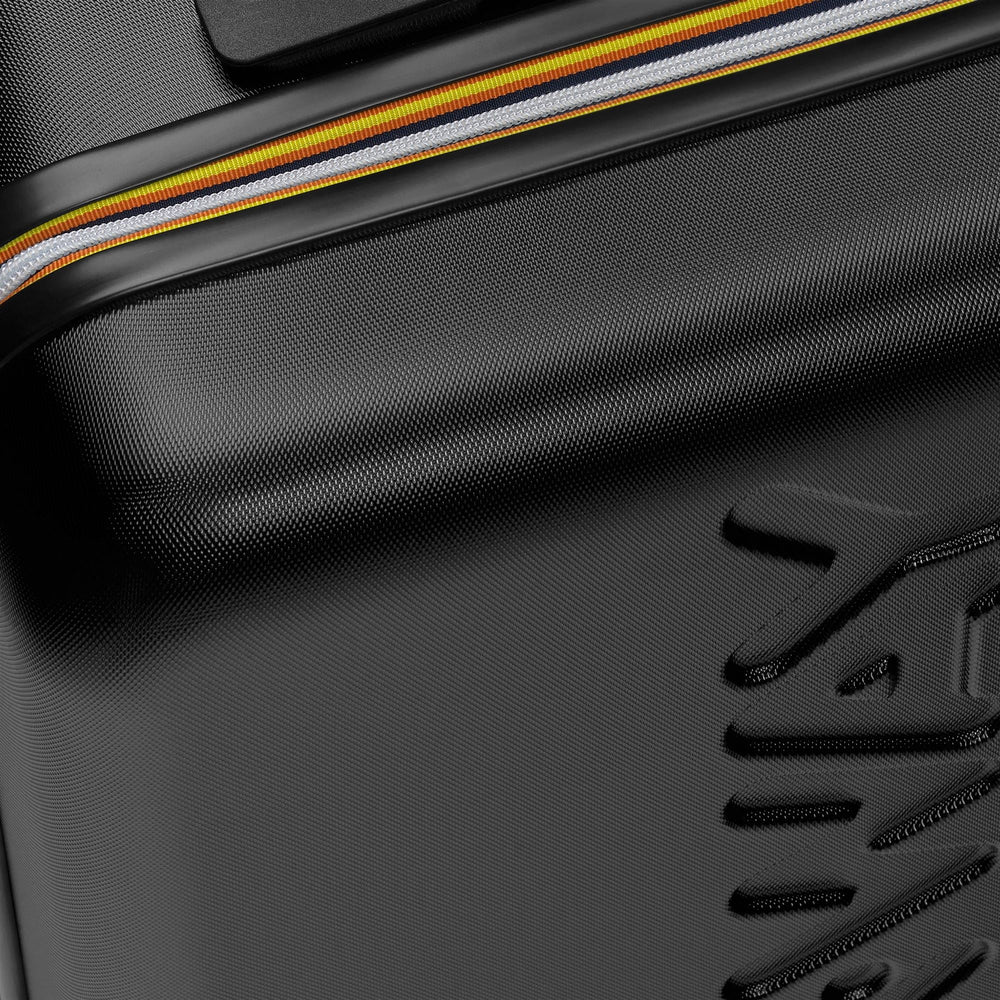 Travel Hard Trolley Medium with a large printed K-Way logo on the front. The accessory features four 360° swivel wheels for maximum freedom of movement, three zip pockets inside, and multicolor cross elastics. Combination and TSA lock closure.