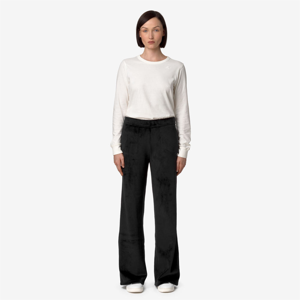 The Jenny women's pants are distinguished by their soft, cozy design with a lifestyle appeal and are crafted from a combination of different colors and fabrics. The exterior features smooth, velvety fleece with a subtle shine, while the interior is lined with sherpa-effect fleece, offering medium warmth suitable for mid-season wear. These flare-cut pants highlight the feminine silhouette with a fitted leg that flares at the bottom and an adjustable drawstring waistband.